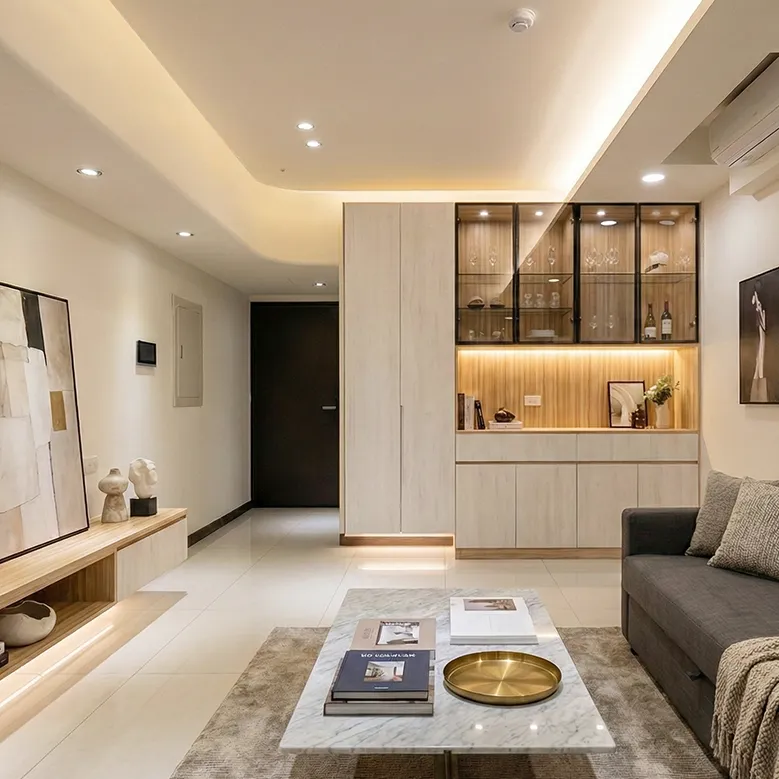本案挑戰 13 坪空間極限,以「機能最大化 × 視覺輕盈感」為核心。透過黑框玻璃拉門、弧形天花語彙與架高收納系統,消弭小宅的壓迫感。從玄關懸浮櫃到多功能房,每一寸空間都兼具實用與溫度,實現都會生活的美