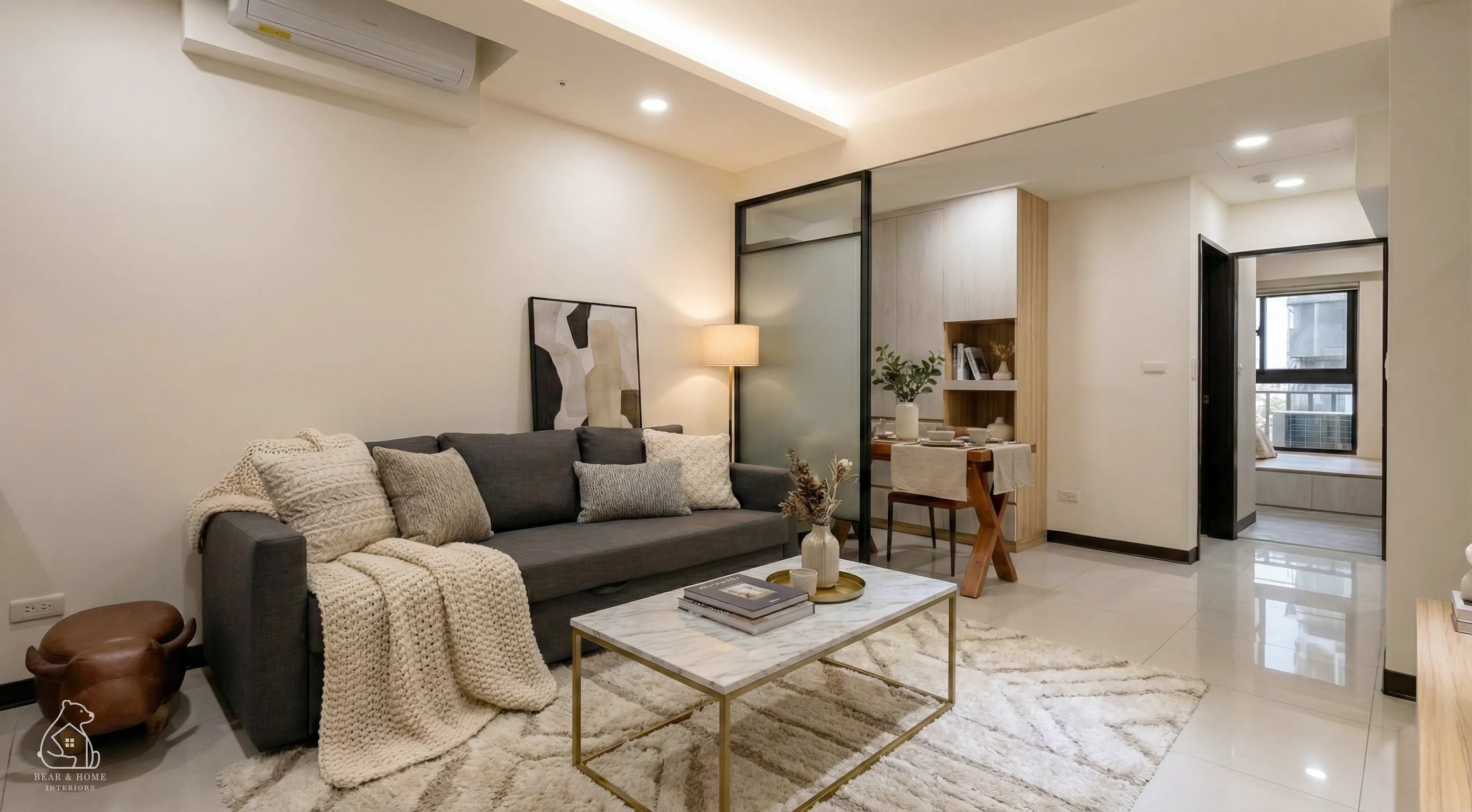 本案設計團隊以「溫暖生活感」為主軸,針對小坪數最在意的壓迫感與收納難題,運用淺色木紋、穿透性材質與弧形線條,將空間自然放大,讓家不僅機能完備,更保有呼吸的節奏。