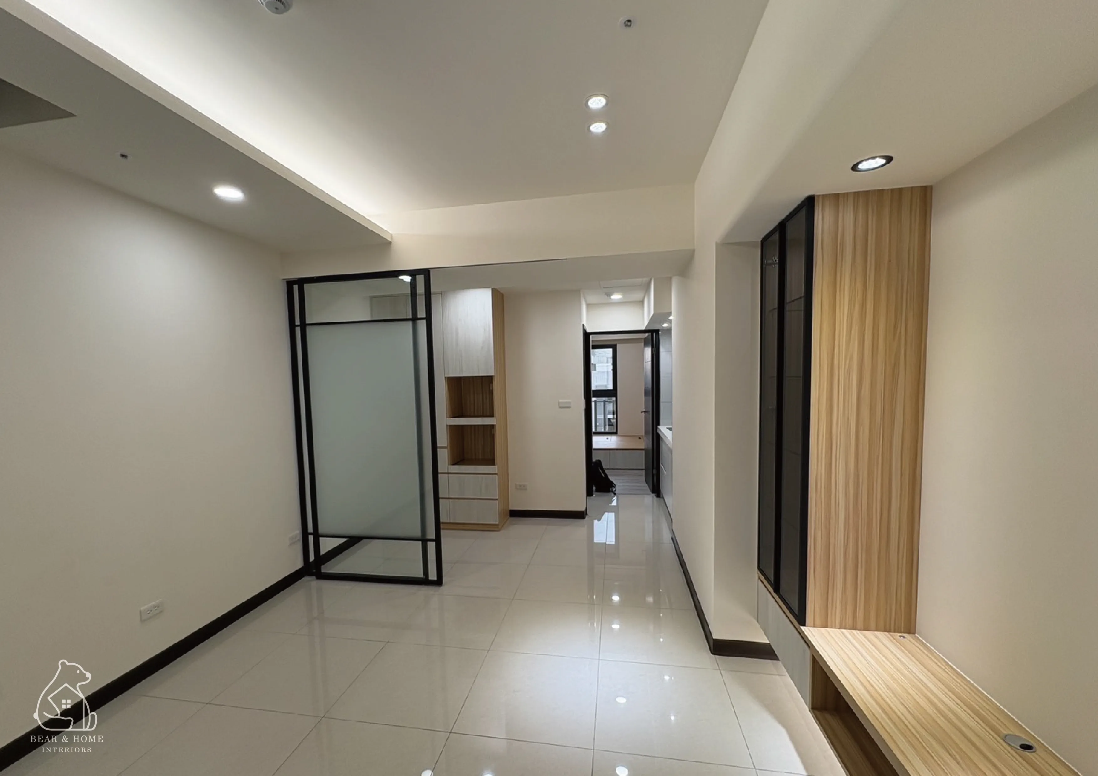 土城新成屋設計|13坪兩房小宅放大術|通透玻璃隔間×海量收納×溫潤木質|新北室內裝潢|土城世界花園