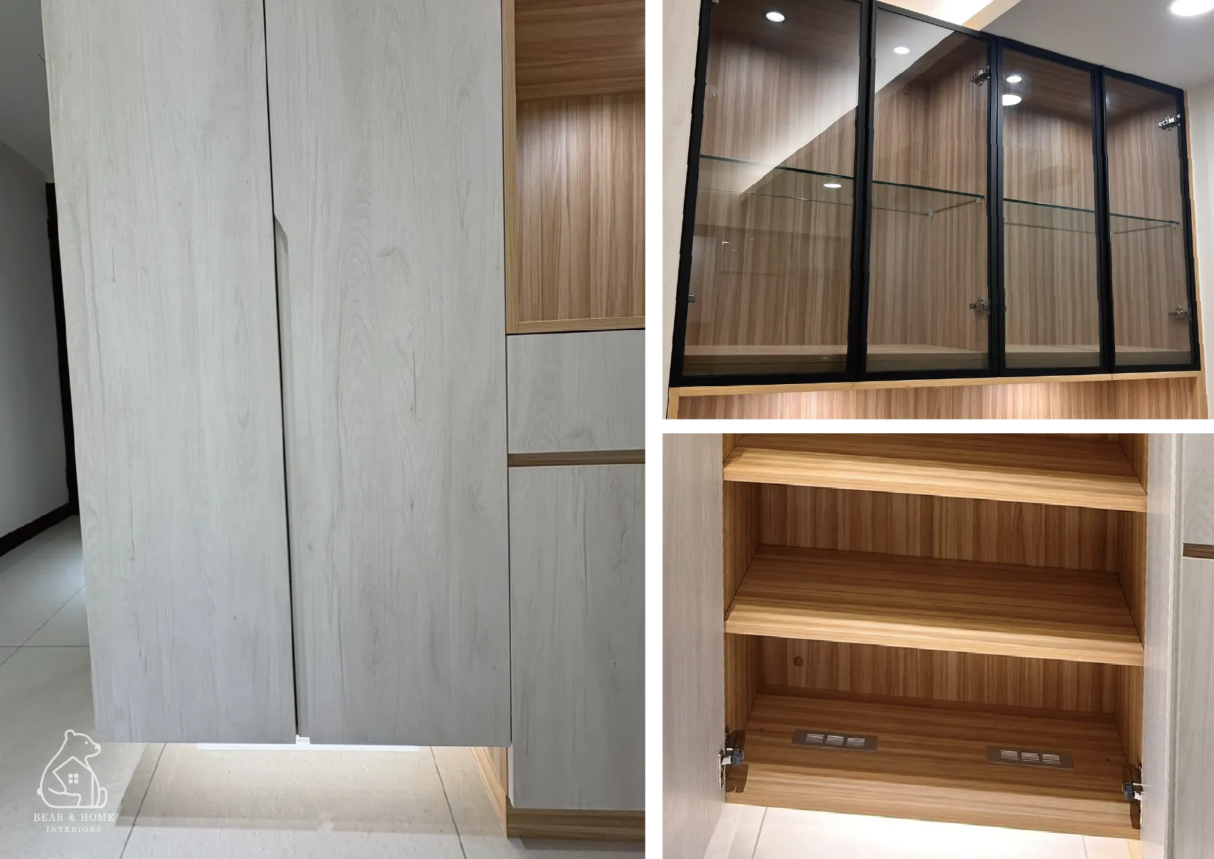 從櫃體把手的隱藏式設計、玻璃拉門軌道的順滑度,到全室統一的淺色木心板選材,我們專注於每一處微小的工藝。