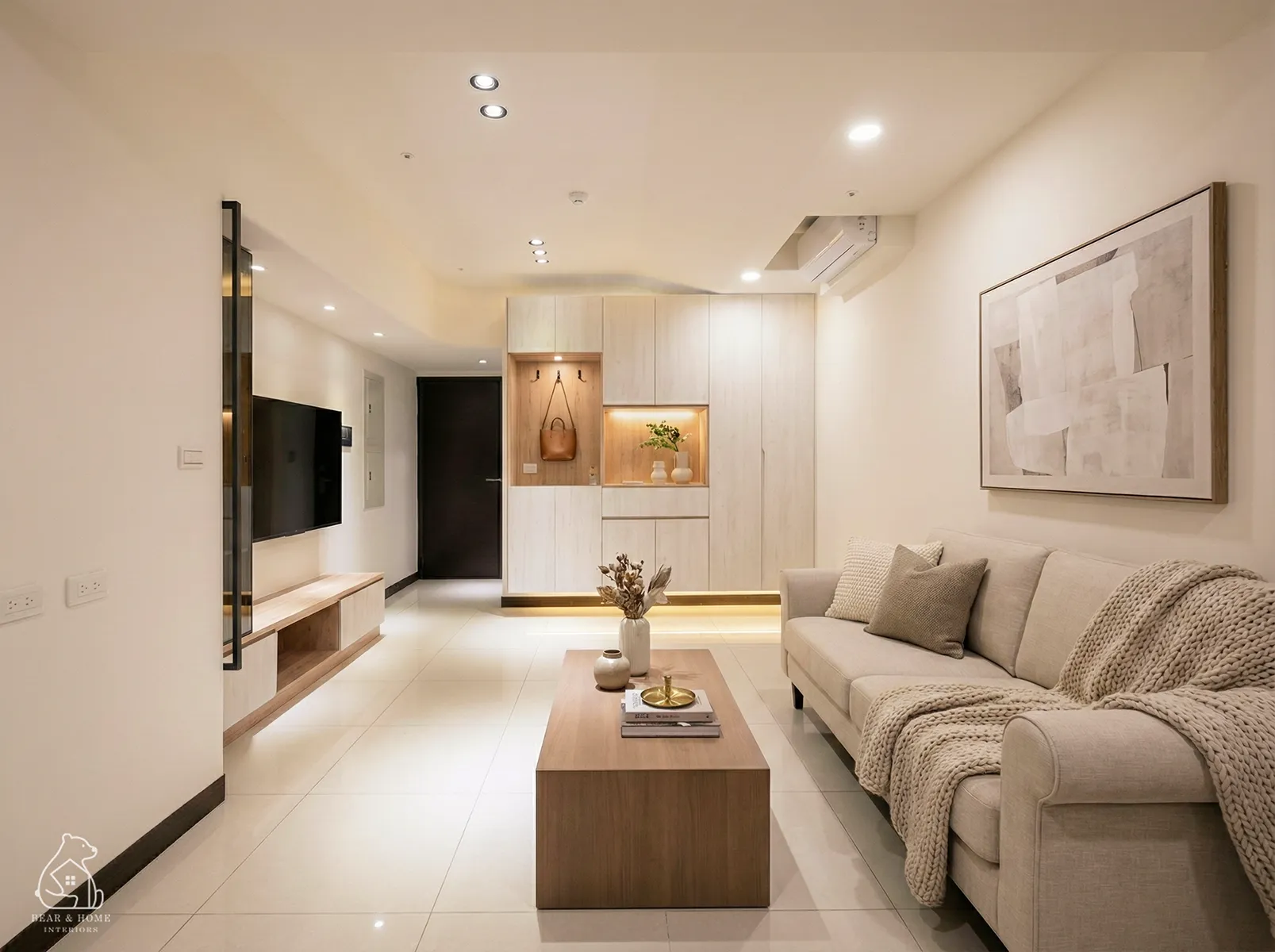 客廳區域強調硬體結構的純粹性。天花板不做過度複雜的造型,而是利用層次落差與崁燈、線型照明等硬體燈具配置,拉高空間的視覺感受,並利用光影界定出不同的機能區域。牆面保持潔淨的基底,搭配淺色系超耐磨木地板或磁磚,奠定明亮、整潔的空間基礎調性。