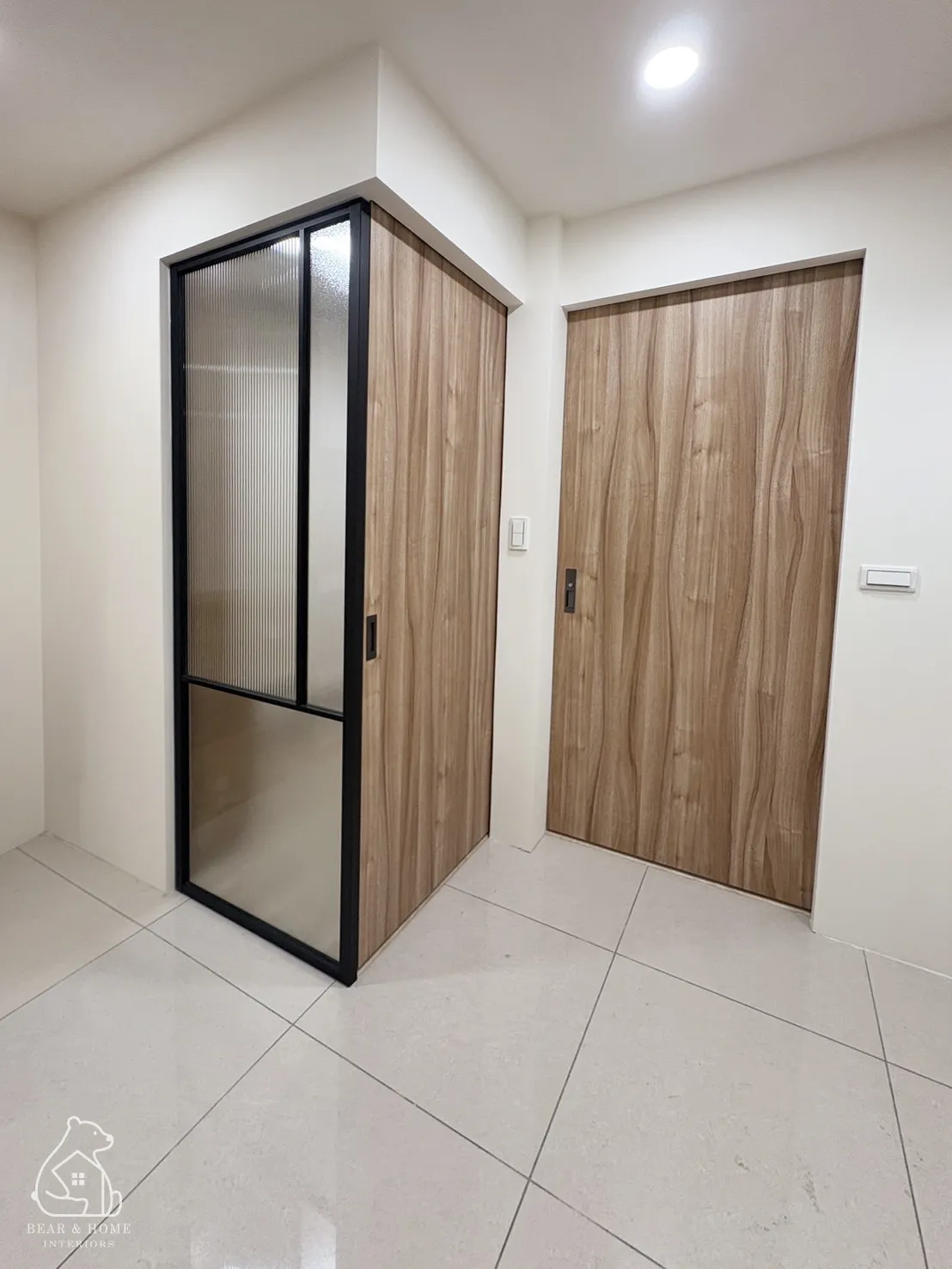 材質結合工藝:我們結合了兩種截然不同的材質。一是帶有黑色細框鐵件結構的長虹玻璃 (Fluted Glass) 拉門,利用其透光不透視的特性引入光線;另一側則搭配溫潤質感的木作拉門,提供紮實的隱蔽性。
