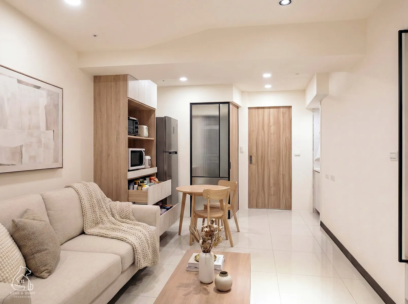 小坪數的收納關鍵在於「垂直空間」的硬體利用。我們在廚房鄰近區域規劃了頂天立地的複合式電器櫃體。