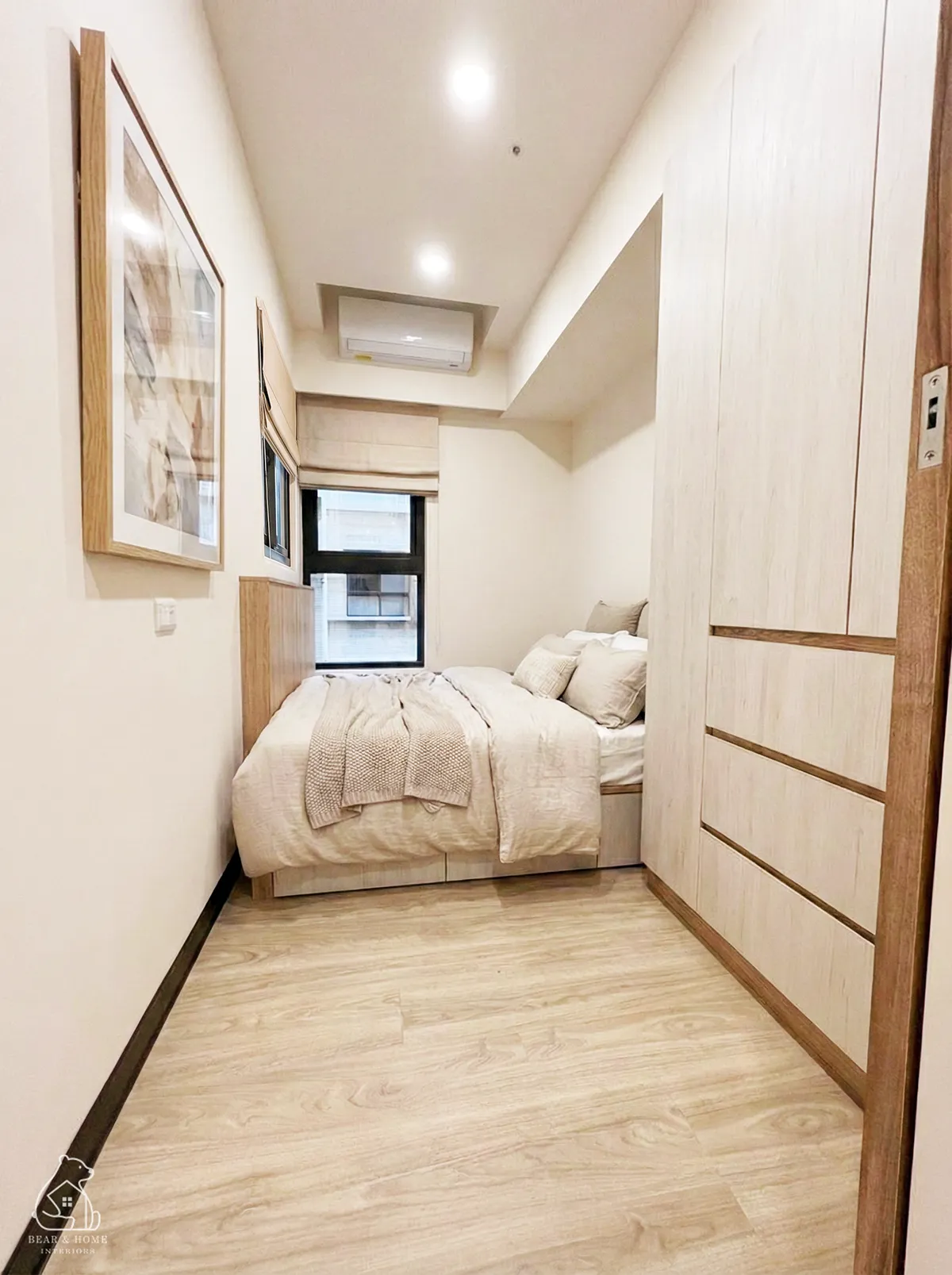一體化整合:床頭板、邊櫃與架高床座皆採用一體化的系統設計構建,展現高度整合的模組化硬體工藝,讓空間線條更趨簡潔、施工品質更穩定。